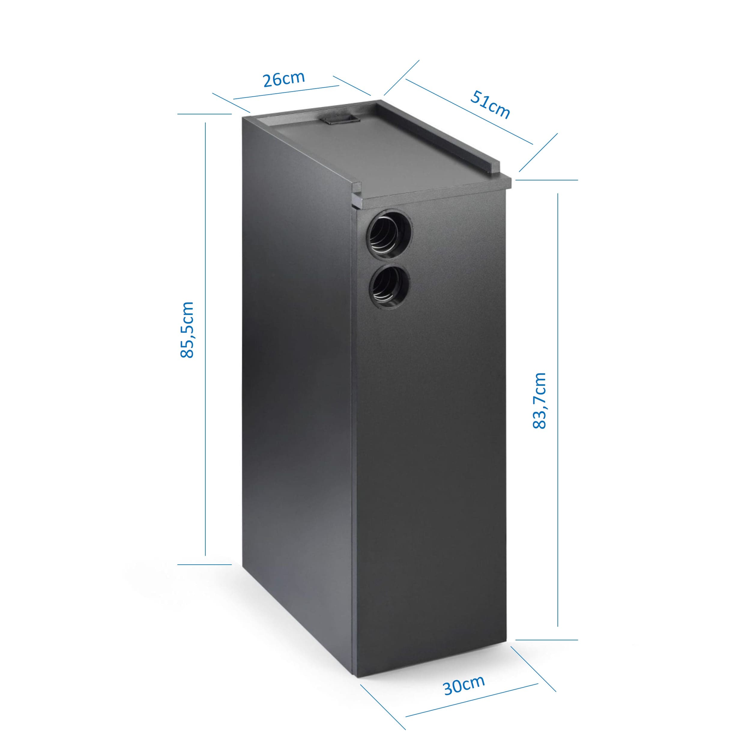 Das Schränkchen mit dem doppelten Becherspender bietet im Inneren neben dem Abfallkorb noch genügend Platz für die Aufbewahrung von Verbrauchsmaterialien und eine externe CO2 Flasche